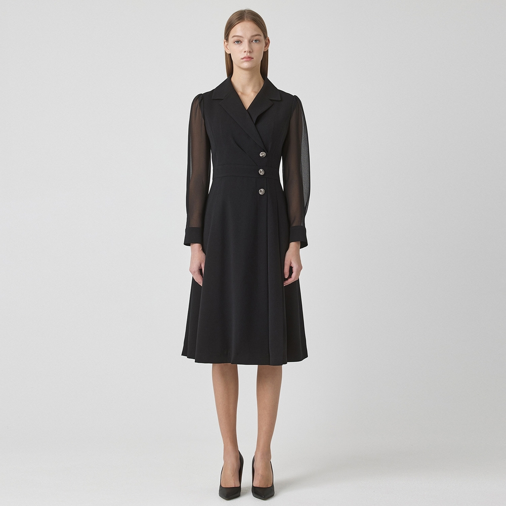 [KL]시스루 슬리브 사이드 플리츠 롱 원피스 KGOPMB9200