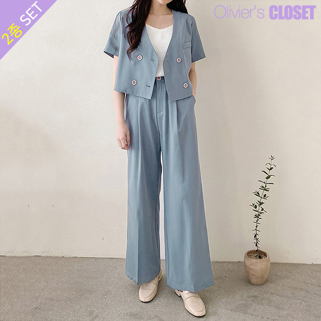 [쿠폰가 39,700원] 더블버튼 숏 자켓 팬츠 2종세트_O2205SE065B
