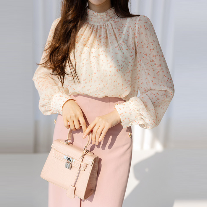 [스타일온미] 제오브 핀턱 하이넥 셔링 플라워 블라우스