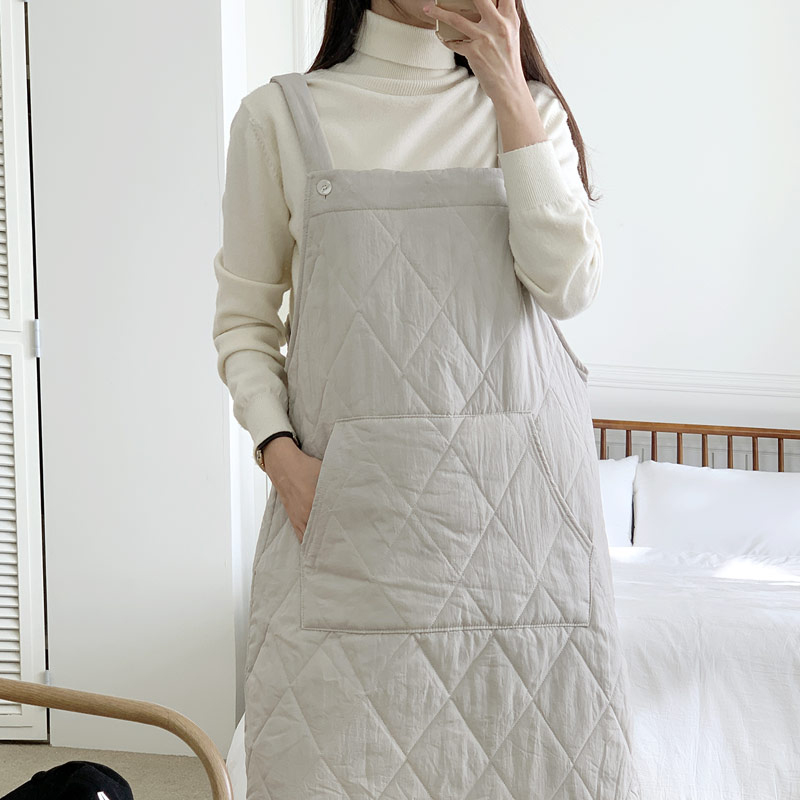 Sconetail 패딩 단추 멜빵 레이어드 롱 원피스