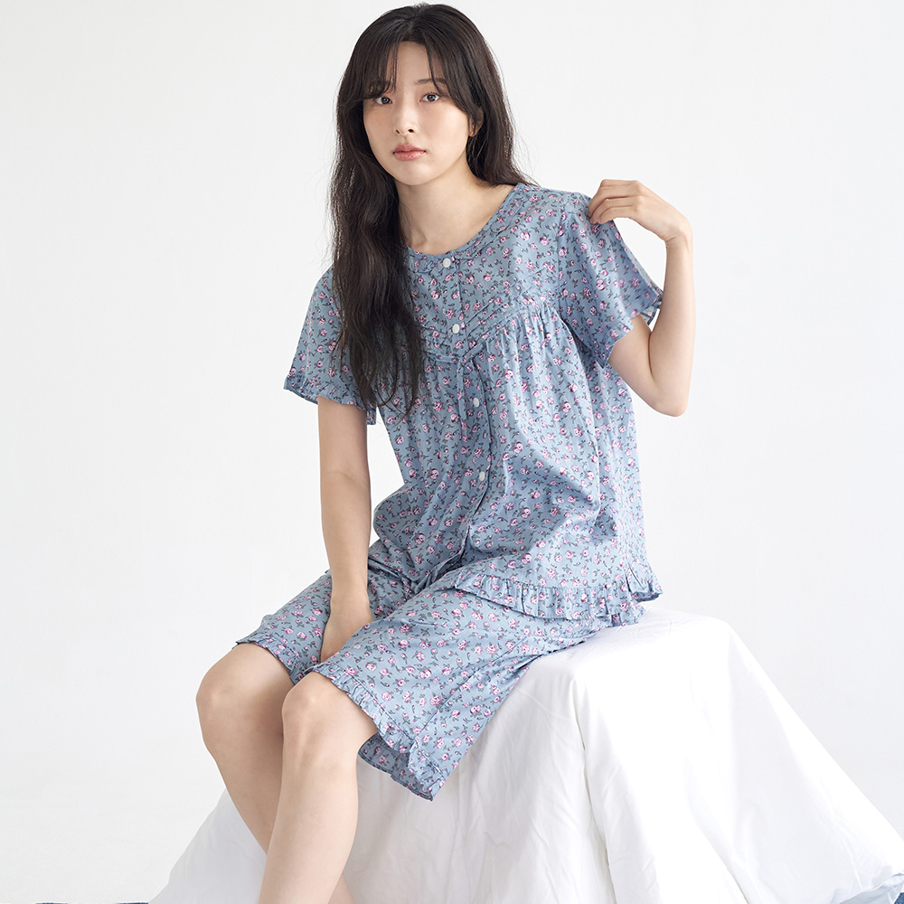 진한블루꽃 순면 여성 반팔 빅사이즈 잠옷 세트