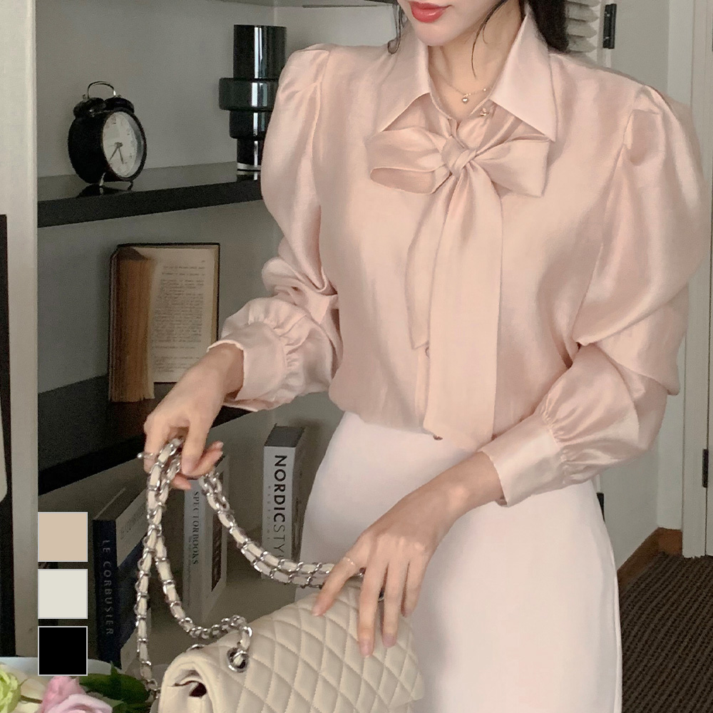 [빠른배송] 오간자 리본타이 카라 퍼프 블라우스