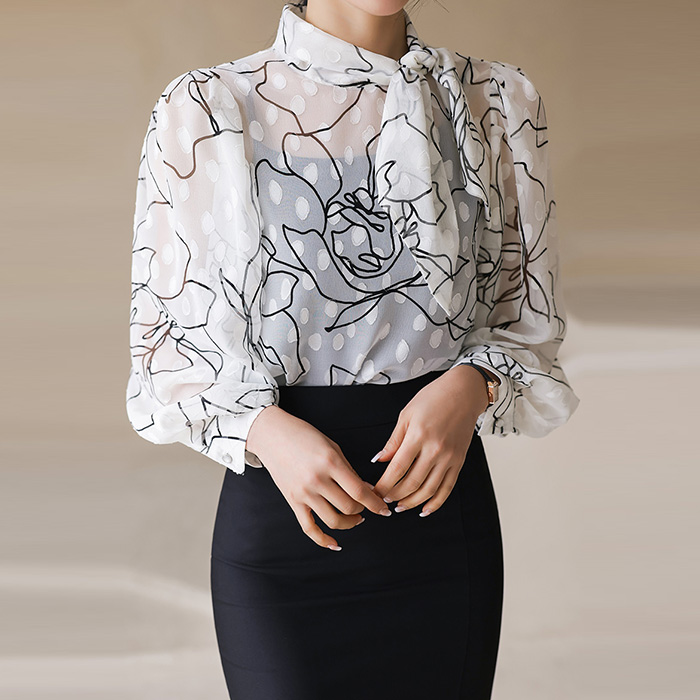 [루이스엔젤] 드로잉 플라워 도트 쟈가드 스카프넥 퍼프 블라우스
