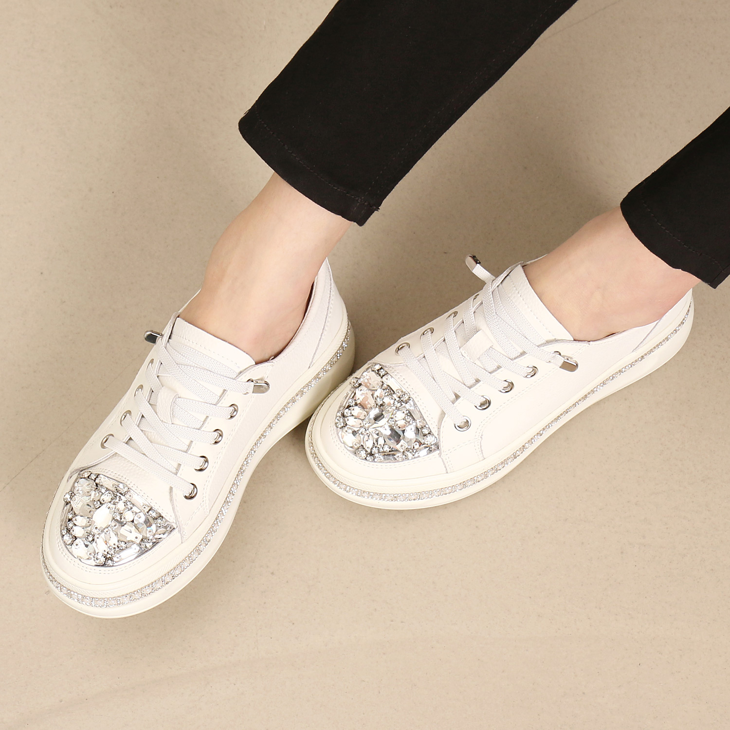 [메쎄]소가죽 큐빅장식 진주 플랫폼 밴딩 스니커즈 MS248073WH