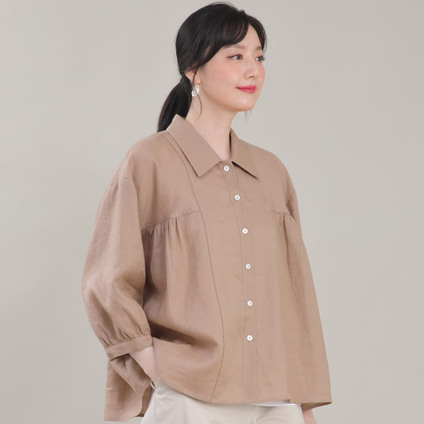 베스 린넨 옆셔링 카라 셔츠 단추 퍼프소매 칠부 여름 루즈핏 남방 블라우스 B08415