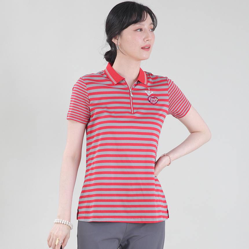 피오나 스트라이프 요꼬 카라 여성 여름 반팔 지퍼 티셔츠 A09414