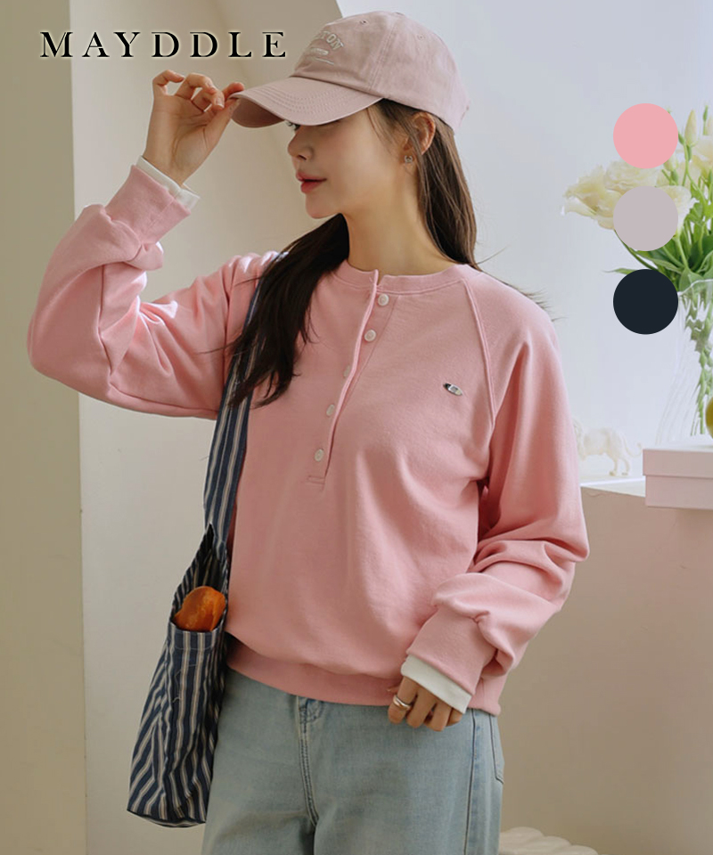 파인탄탄 반오픈맨투맨 / 영문 팬던트장식 라운드넥 루즈핏 스판 신축성 단추 편한 쭈리 긴팔스웻셔츠 백메란지 네이비 브라운 딸선물 봄 가을 간절기코디 꾸안꾸코디