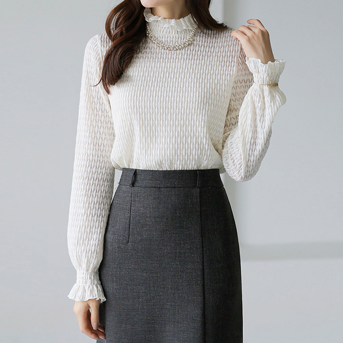 [루이스엔젤] 크렘므 스모킹 셔링 레이어드 시스루 다이아 레이스 블라우스 티