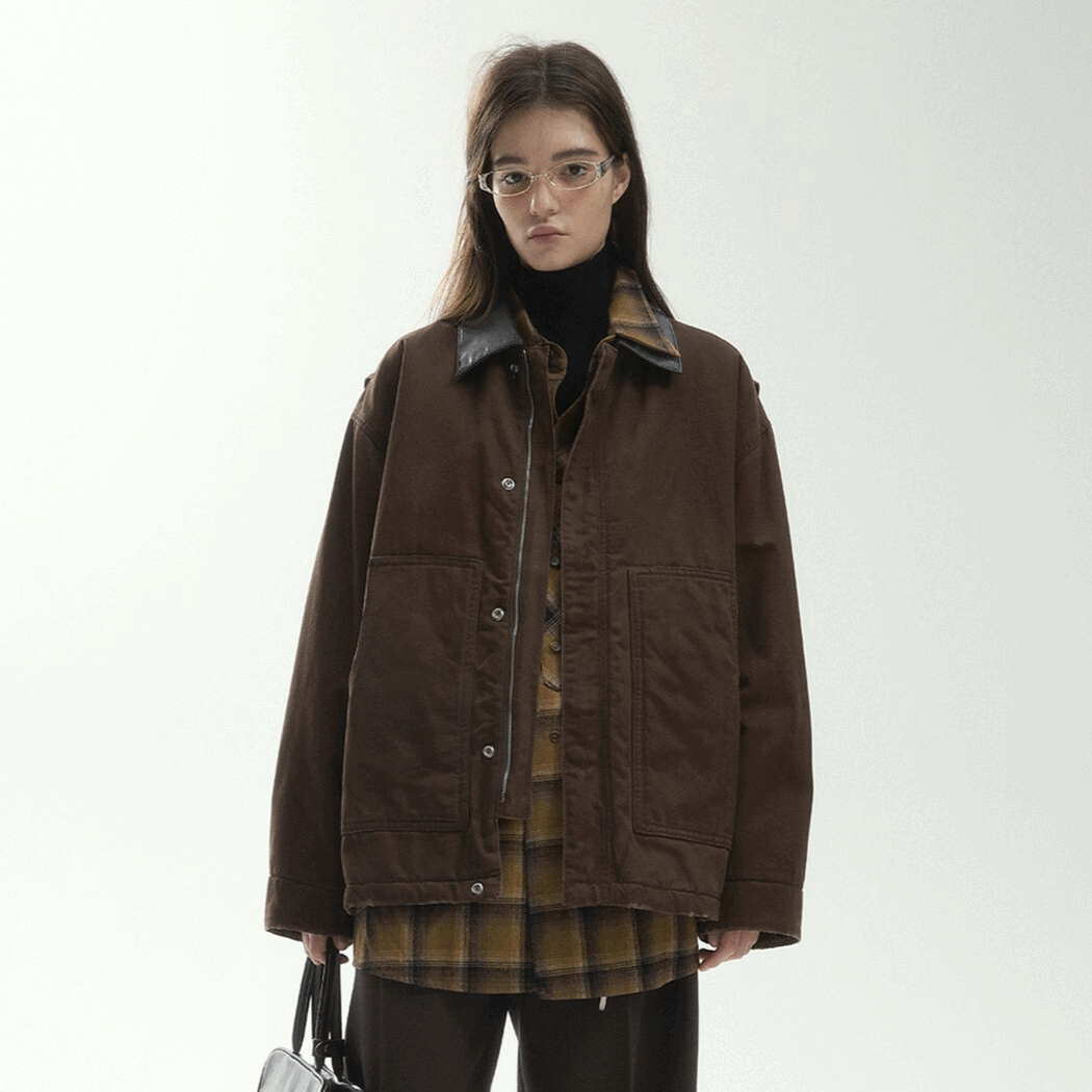 넥라인 가죽 스플라이싱 빈티지 자켓