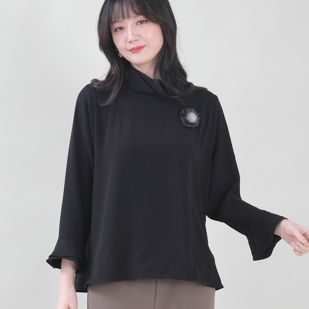 망사 레이스 스카프 일체형 브로치 벨 소매 봄 가을 긴팔 루즈핏 블라우스 B02510