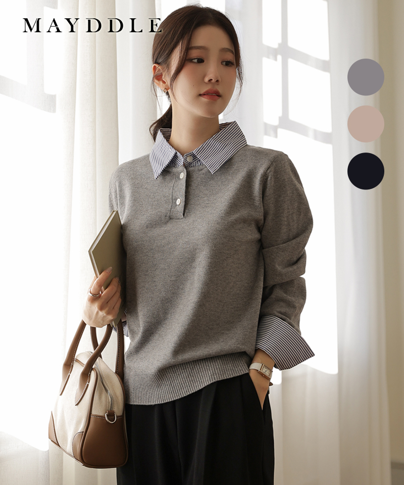 [일체형]줄지콤비레이어드 셔츠니트 / 레이어링 레이어드코디 셔츠룩 단정 오피스 출근 직장인룩 카라넥 긴팔 클래식 스웨터 블랙 그레이 베이지 셔츠니트스웨터 봄 가을 간절기코디