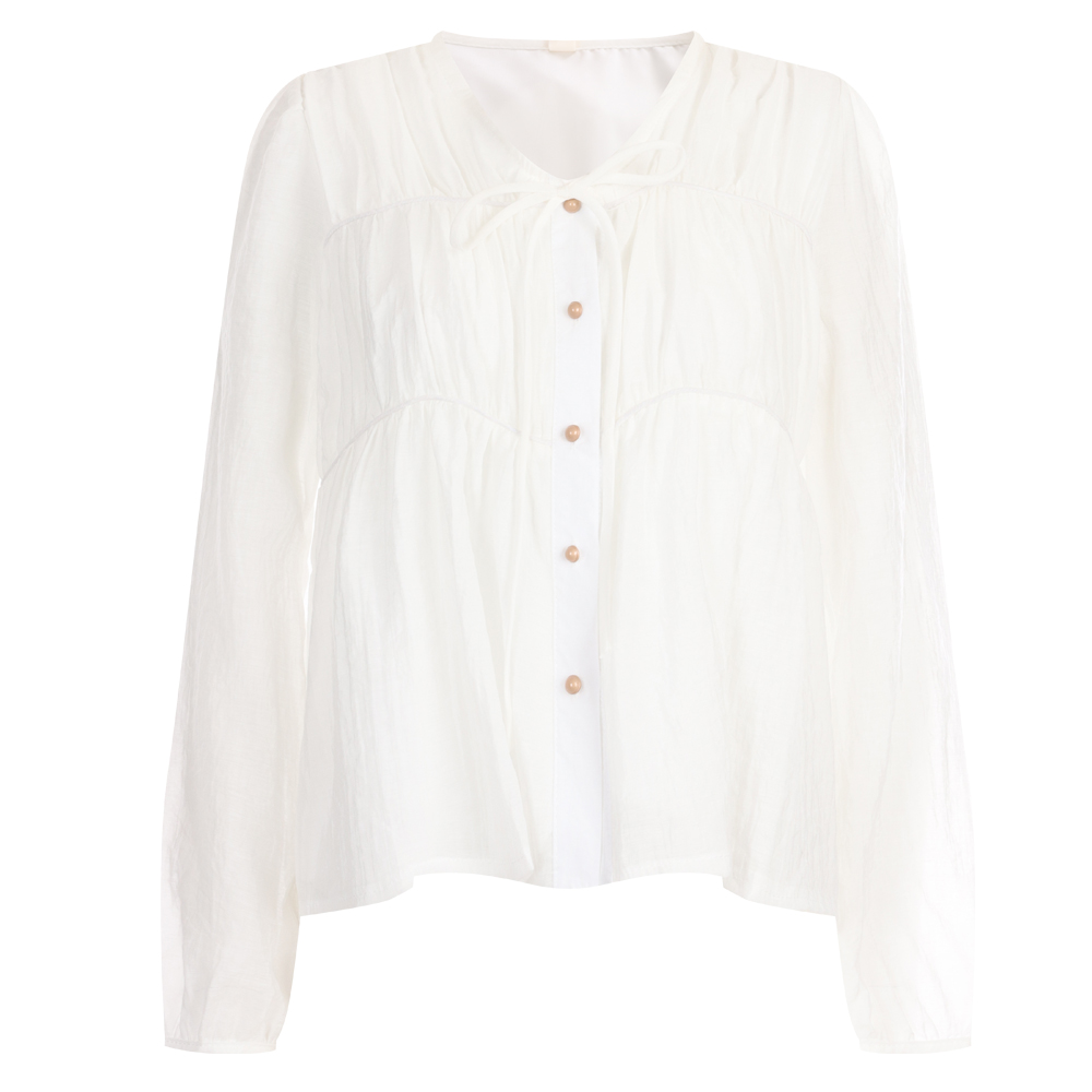 [샵앤] 여성 U넥 쉬어 러플 셔링 리본 러블리 블라우스 SOM-WBL-20338-아이보리