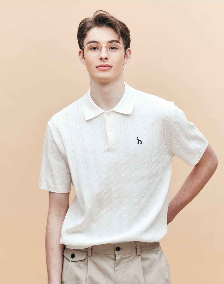[헤지스 남성]아이보리 케이블 반팔 카라 니트_HZSW5B553IV