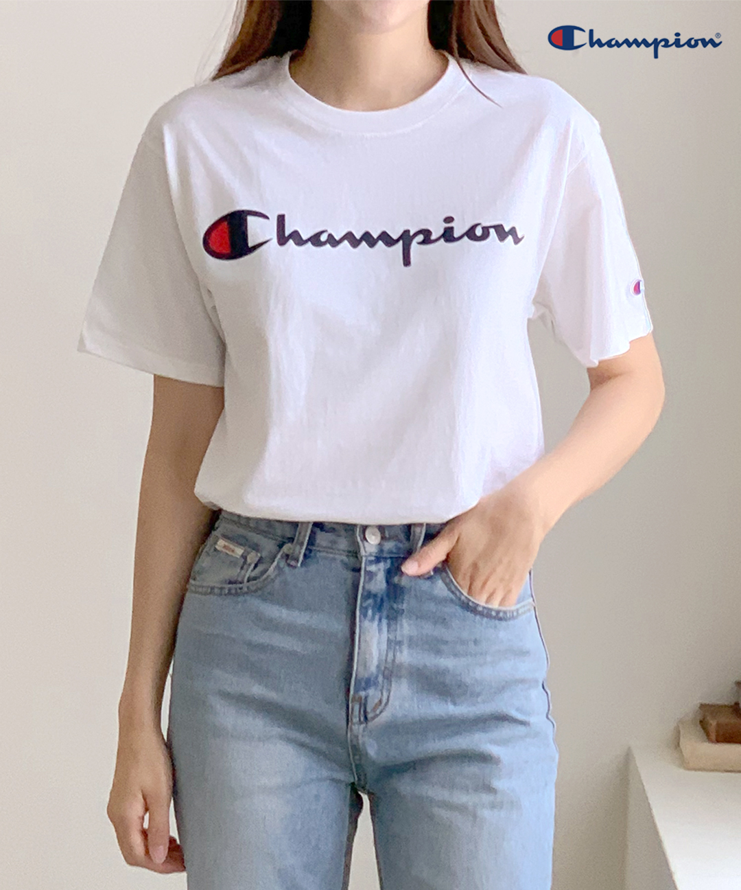 챔피온 로고 프린팅 반팔 기본 티셔츠 남녀공용 GT23H 화이트/네이비로고