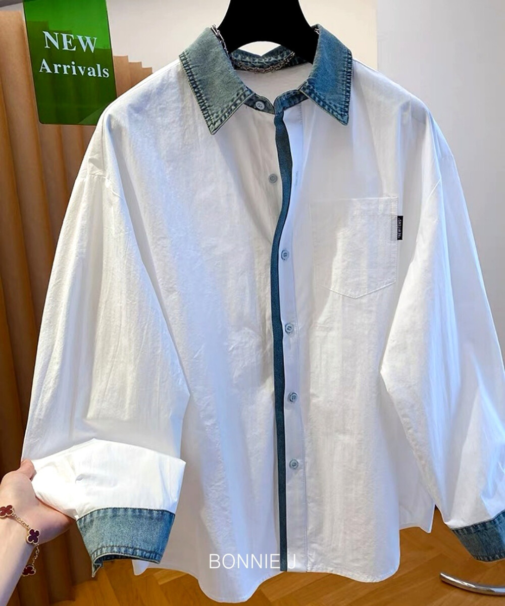[보니제이] 배색 여성 와이셔츠 흰색 남방 오버핏 데님넥 포인트