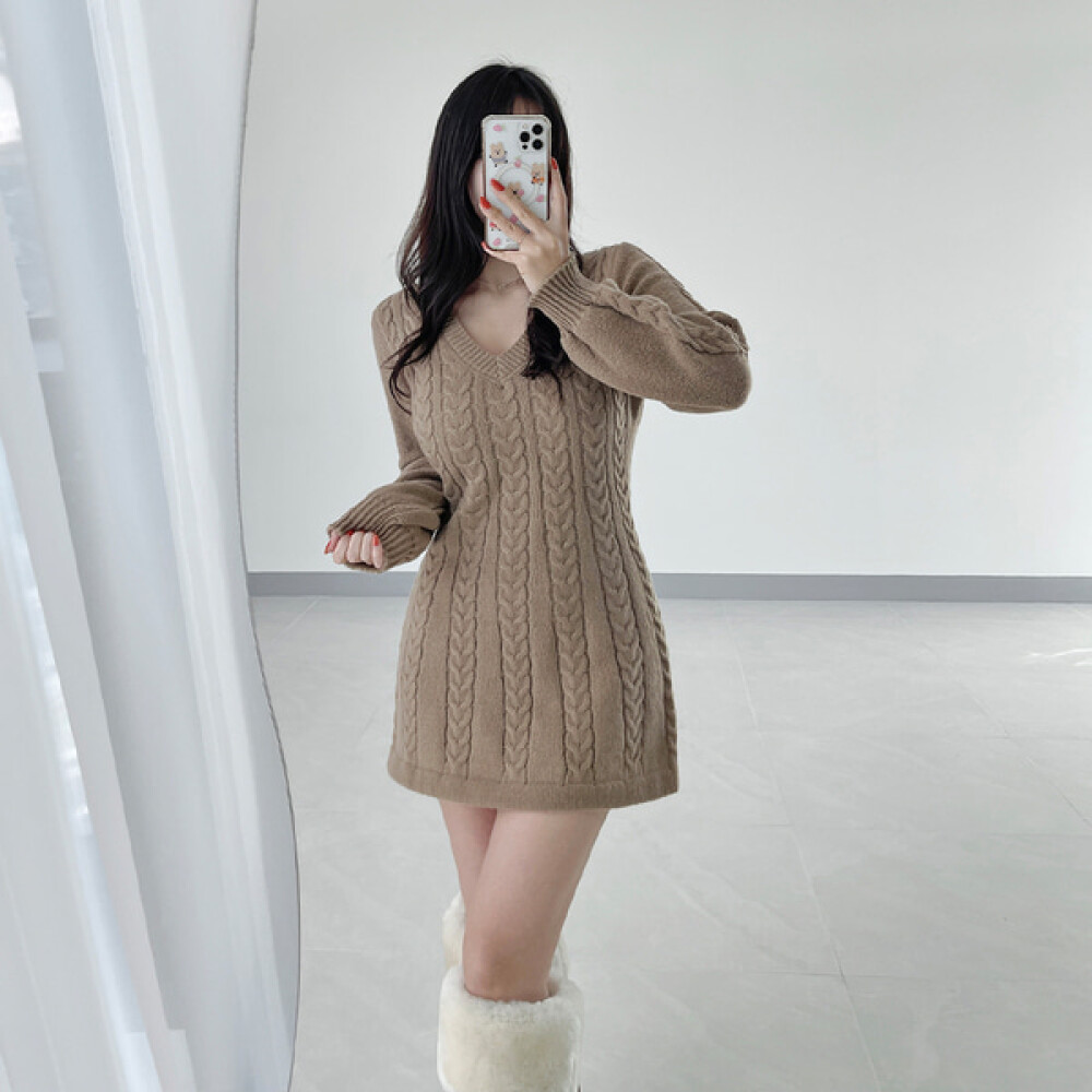 [글램핏] 겨울 러블리 꽈배기 니트 브이넥 케이블 미니 원피스 연말룩 3컬러