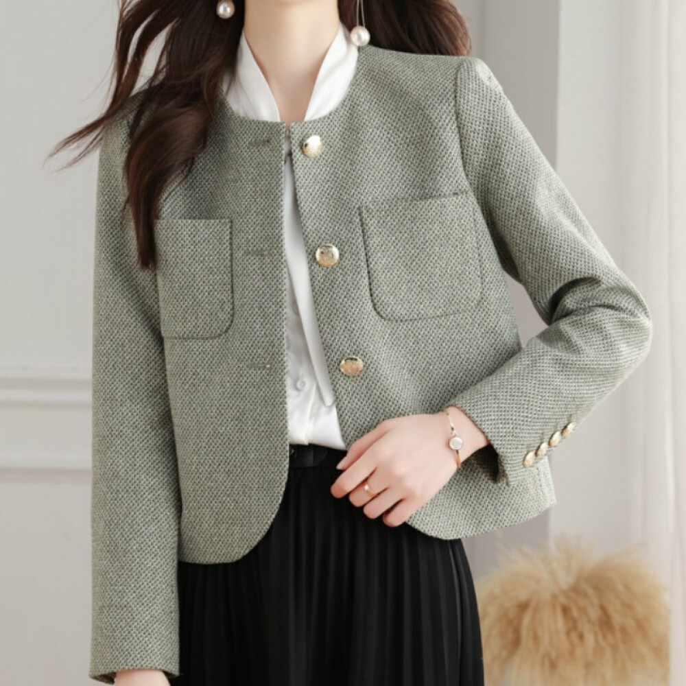[허그허그] 라운더 골드버튼 노카라 트위드 자켓