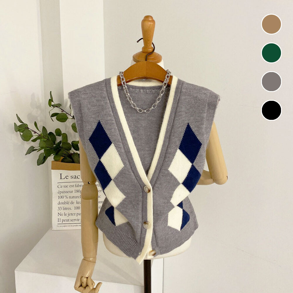 [헤이븐] 델즌 아가일 브이넥 니트 조끼(4color)