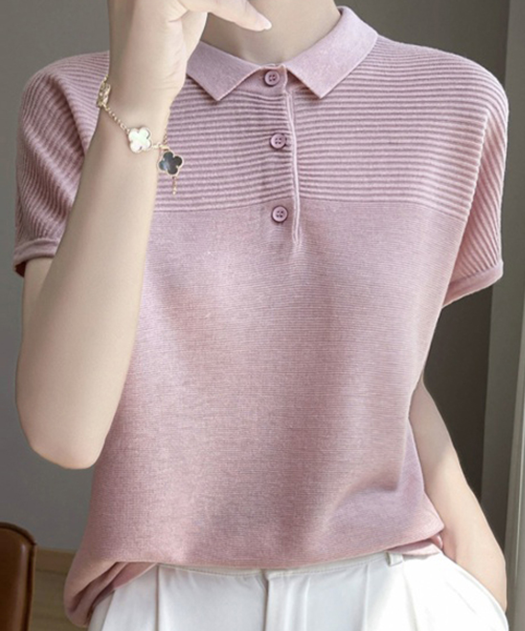 세미 루즈핏 카라 반팔 니트 티셔츠