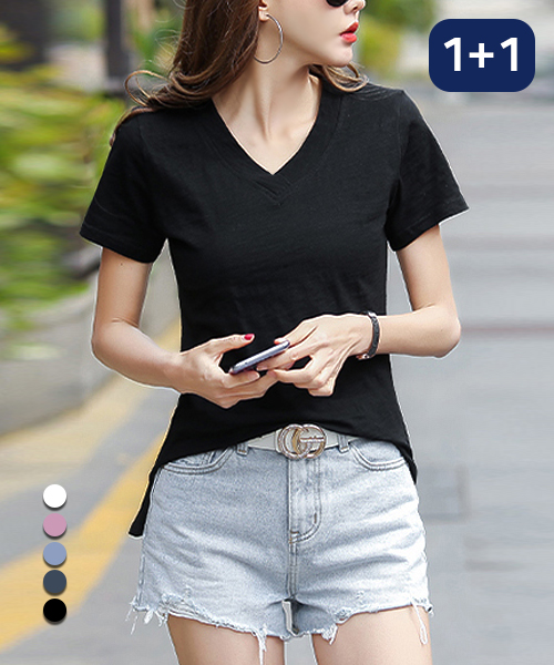 [1+1]코튼 브이넥 슬라브 반팔 티셔츠(5col)