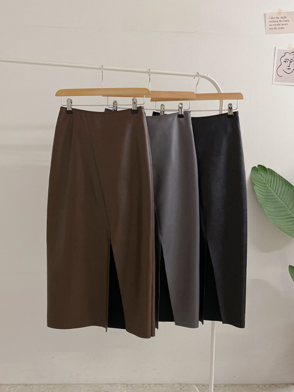 [허니제이] 퓨탄 사선 앞트임 레더 롱 스커트(S~M)
