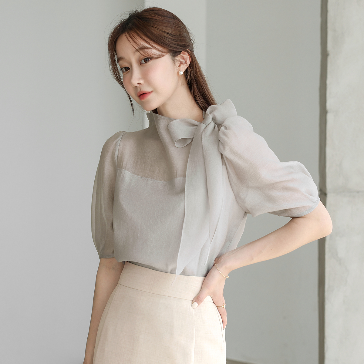 [오브리에] 로이샤 리본 타이 반팔 블라우스