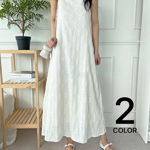 [에르디테] 레이스 자수 펀칭 레이어드 끈 나시 휴가 롱 원피스/ 2컬러
