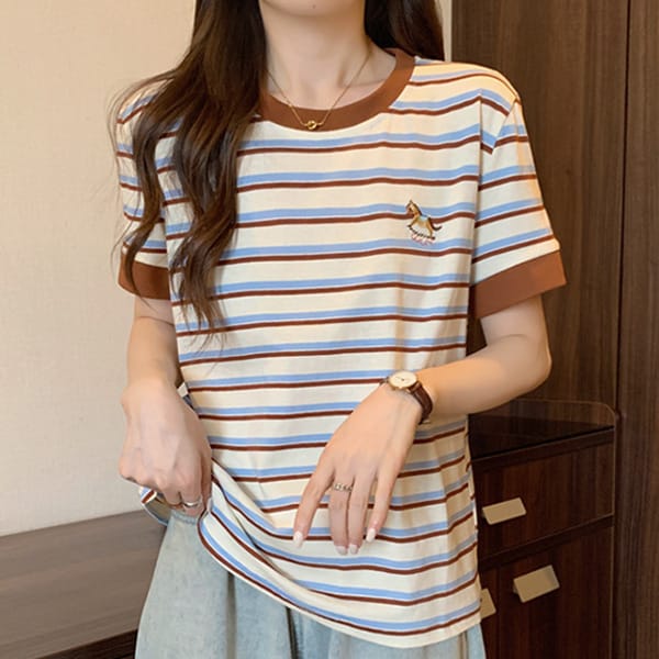 [나바바] NT2638 단가라 배색 자수 포인트 반팔 티셔츠