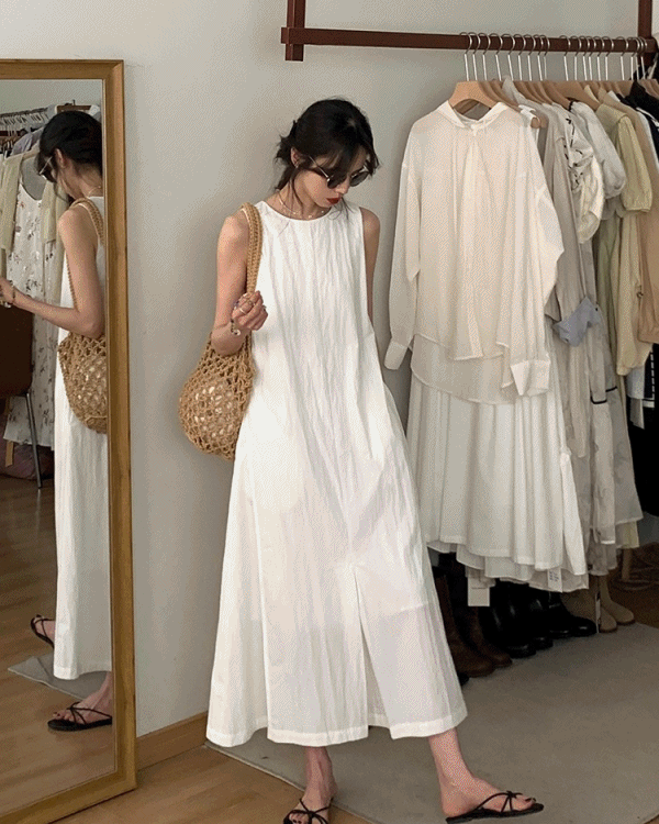 마들렌 라운드넥 나시 민소매 바스락 플레어 롱 원피스 / 하객룩,레이어드원피스,휴양지원피스,롱원피스,나시원피스