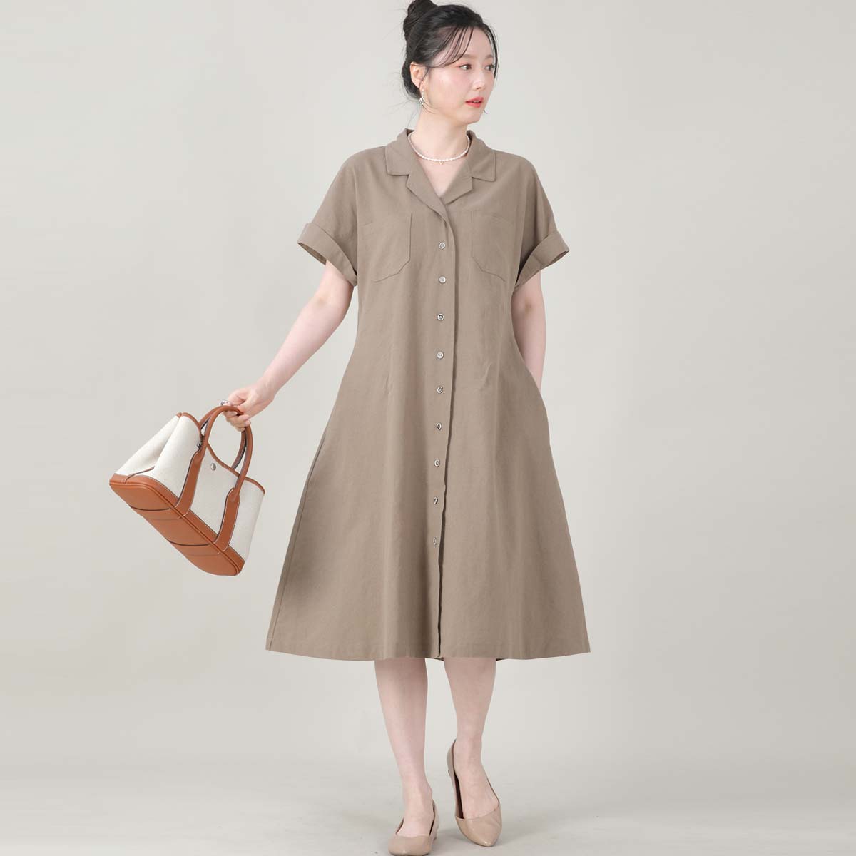 린넨 혼방 테일러 카라 단추 오픈 A라인 여성 여름 카브라 반팔 롱 원피스 K07529