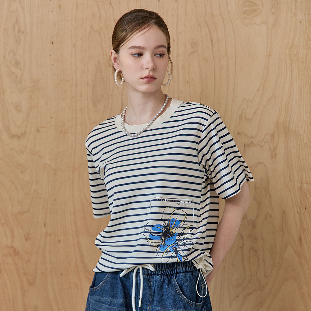 [엠그라프] 플라워 프린트 스트링 스트라이프 티셔츠