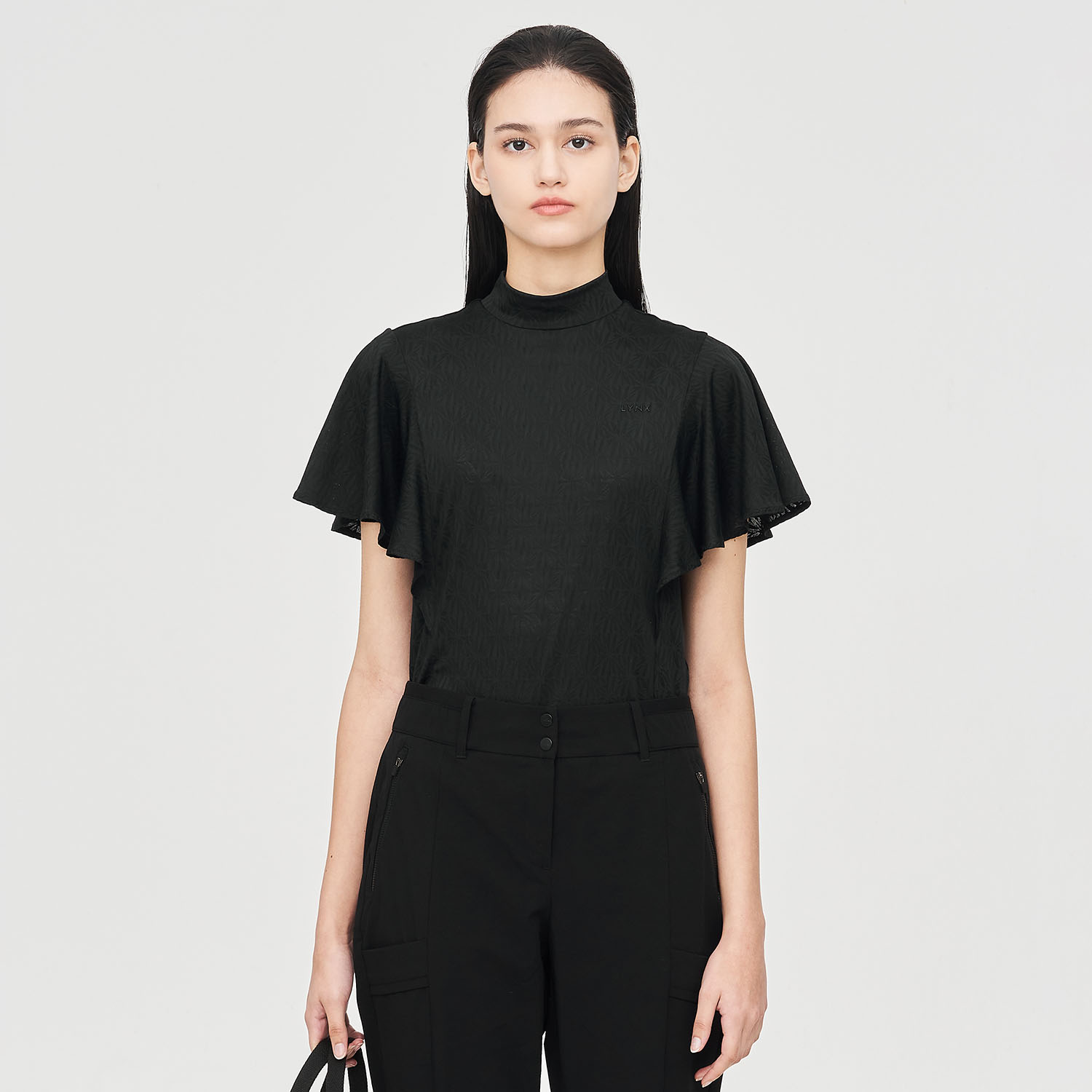 여성 메쉬 자카드 프릴소매 모크넥 티셔츠 L21D2TH358_BK