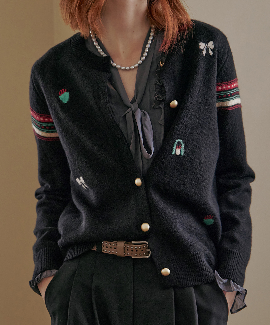 [마쟈] 미니 리본 패턴 라운드넥 니트 가디건