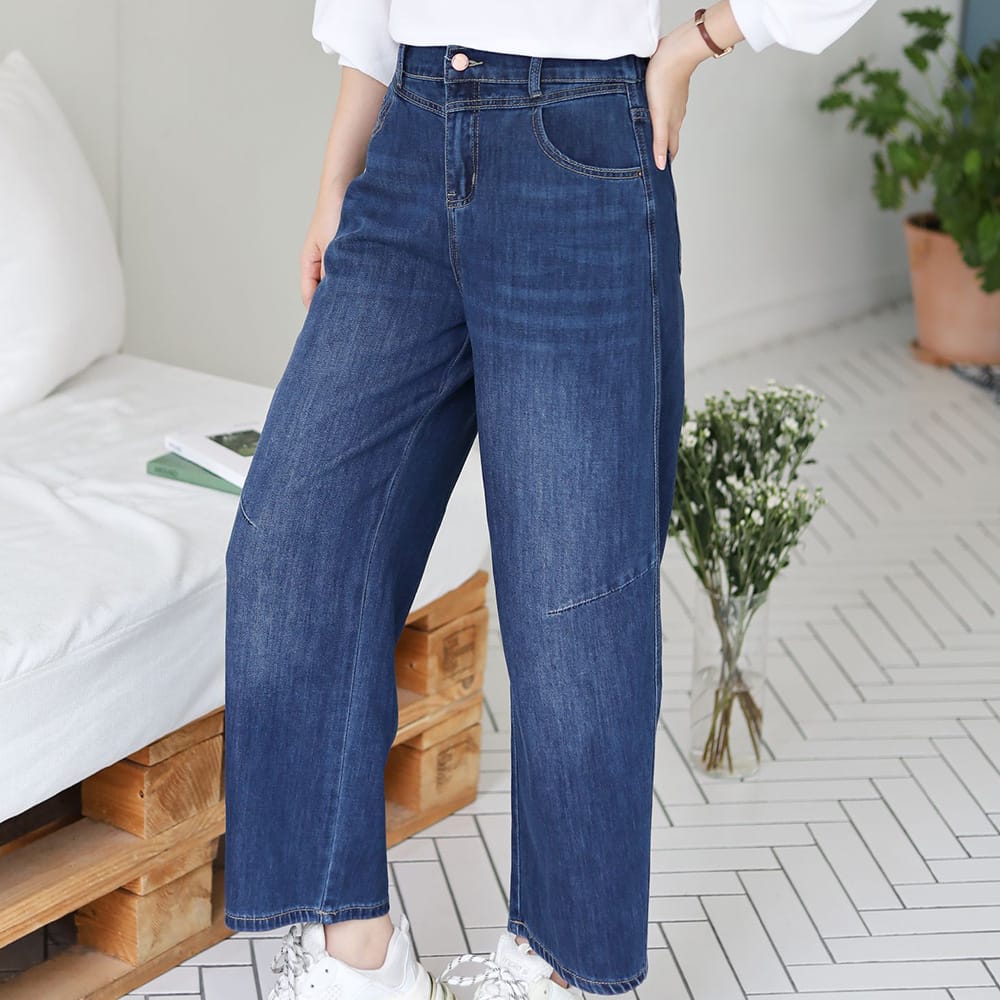 [옷자락] 여자 빅사이즈 가을옷 뒷밴딩 절개 캣워싱 통 청바지