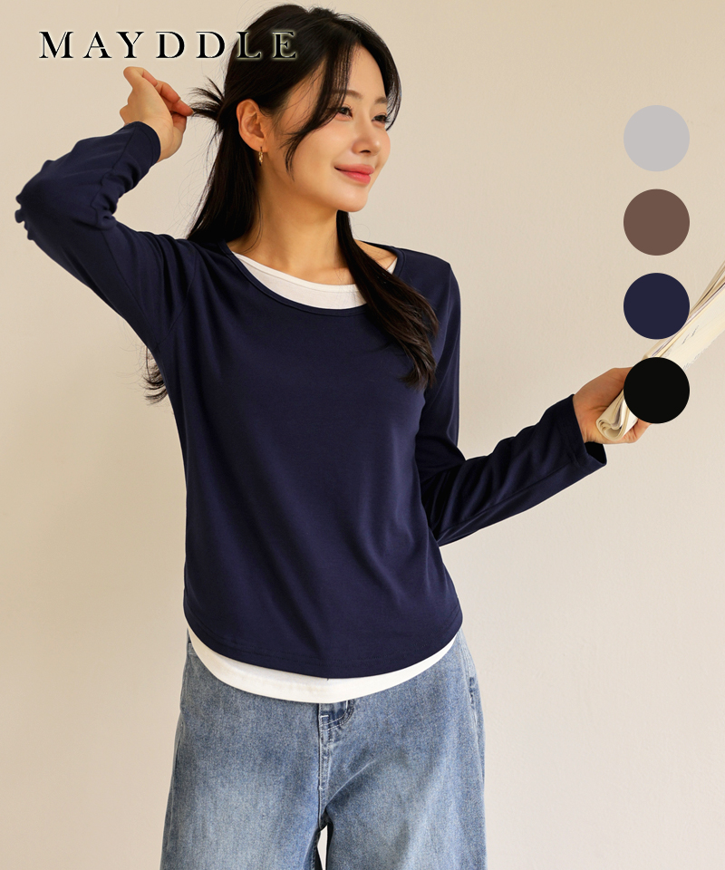 페이크 배색긴팔티 / 유니크 이너 이중레이어드 레이온 스판 텐션 부드러운 슬림핏 기본 긴소매티셔츠 꾸안꾸 딸선물 봄 가을 간절기 브라운 그레이 네이비 블랙 캐주얼 데일리룩