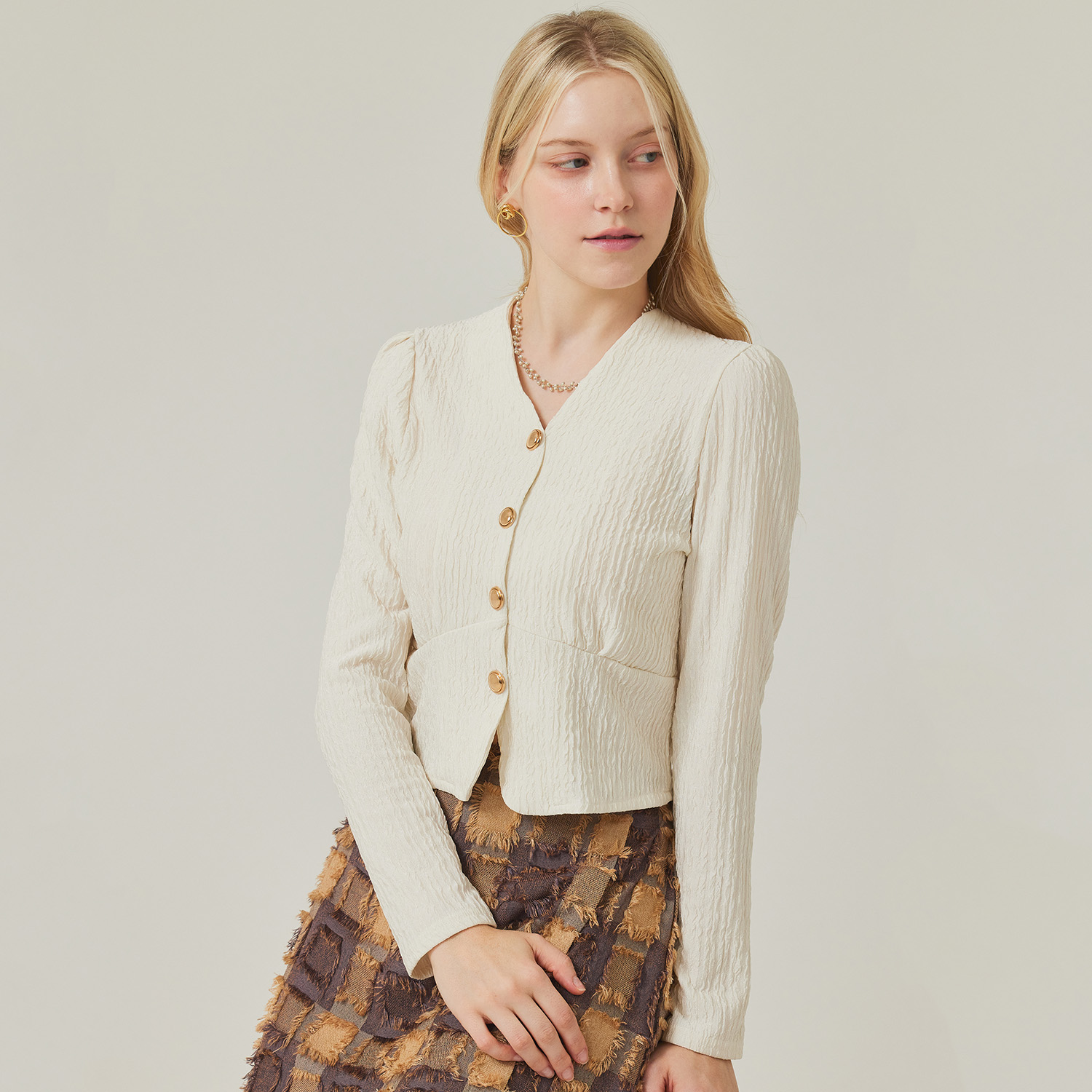[포커스] 페미닌 셔링 텐션 블라우스_VF5F1BL5021