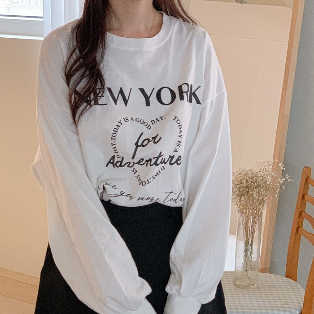 [플러리싱] 박시 루즈핏 뉴 욕 하트 레터링 롱슬리브 티셔츠 [플러