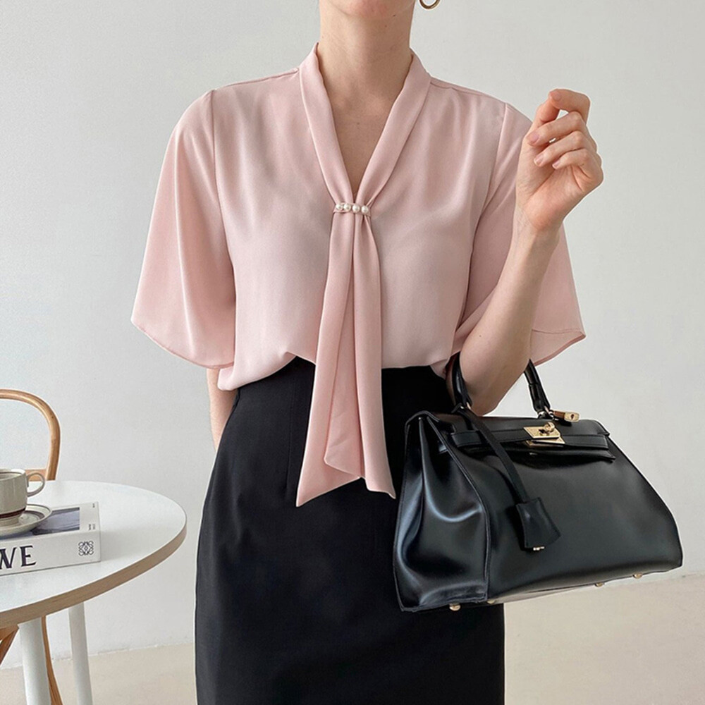 [러블리감성] 한봄 진주 타이 반팔 여름 블라우스 셔츠