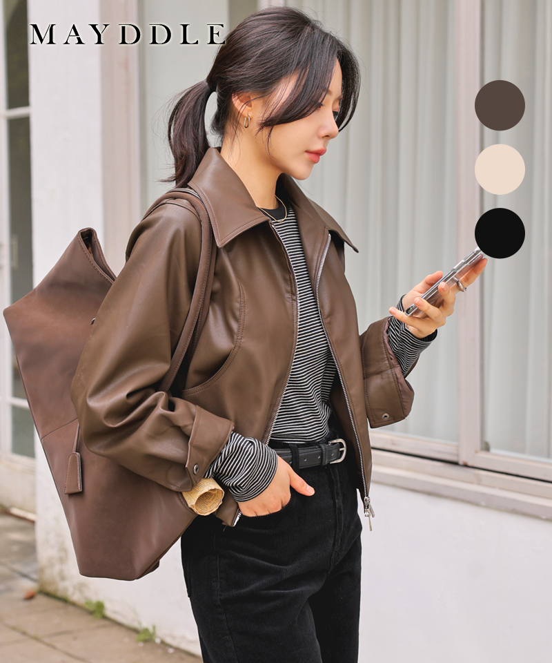 모션블루종 페이크레더점퍼 / 밑단스트링 스토퍼 숏 짧은 크롭 블랙 브라운 베이지 봄 가을 간절기 광택 가죽재킷 직장인 출근룩 집업 카라넥 아우터 라이더잠바