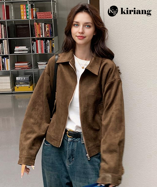 [키리앙] 심플리 카라넥 스웨이드 집업 자켓