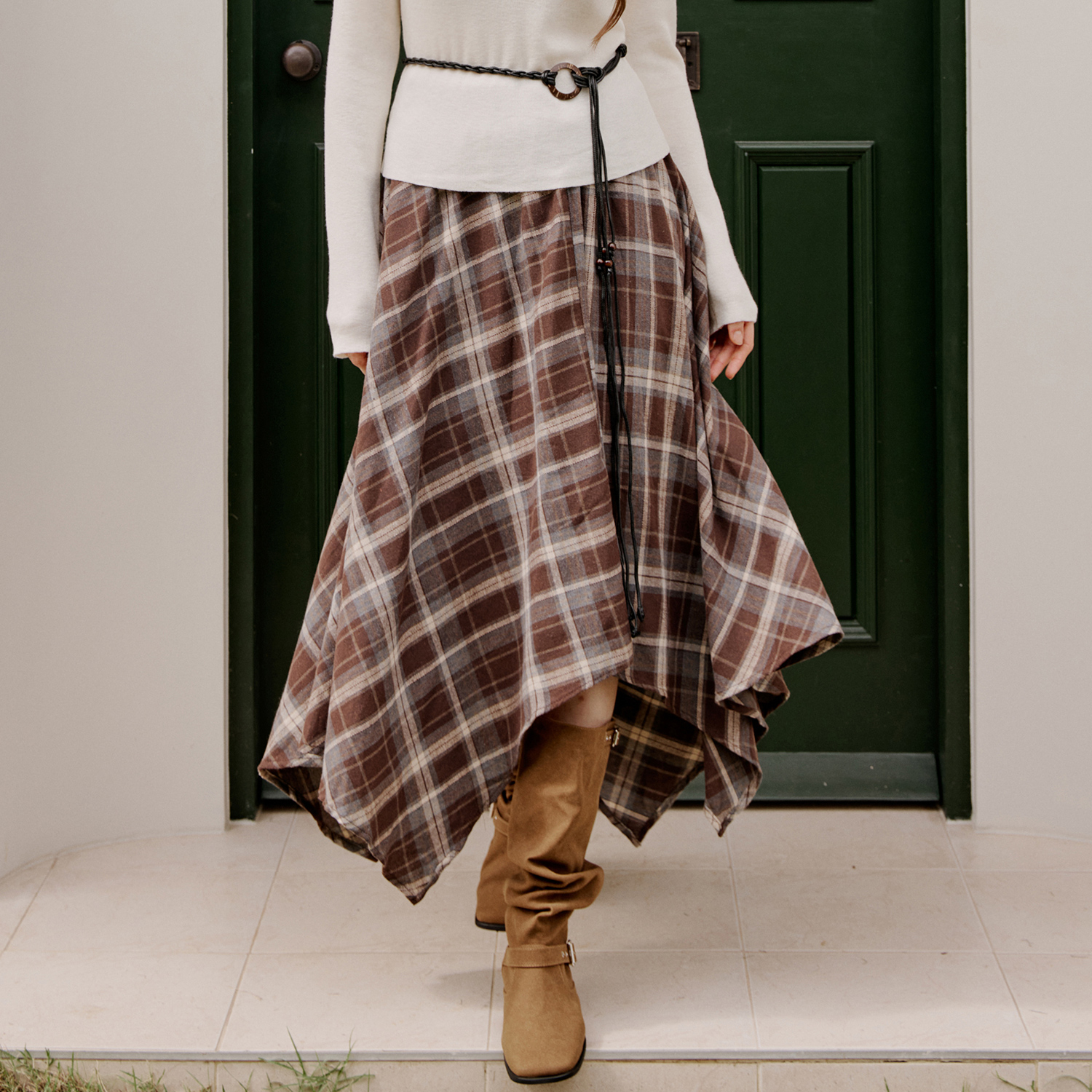 [블루레이스] 벨트포인트 체크 언발 스커트_B5F1SK8131