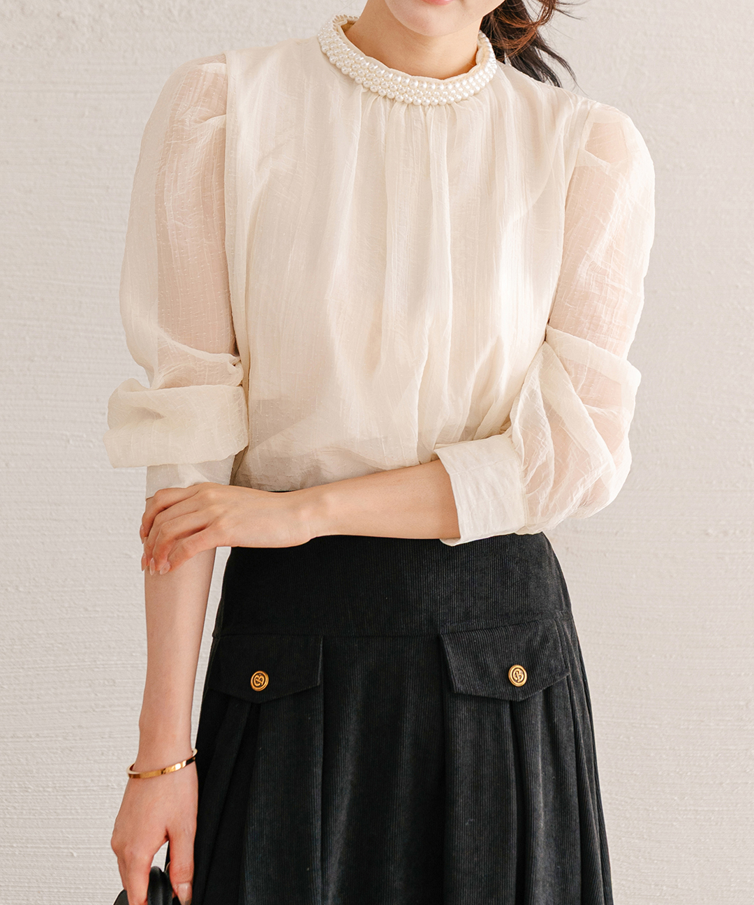 [한정수량][모리스커밍홈] 진주넥 포인트 셔링 블라우스_M2509BL086C
