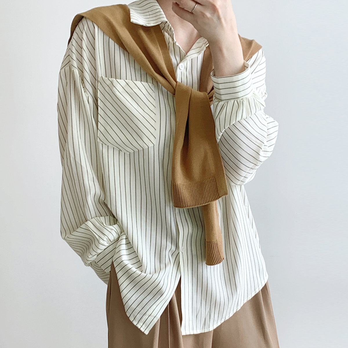 [55~77] 커벨 스트라이프 셔츠 니트 숄 세트