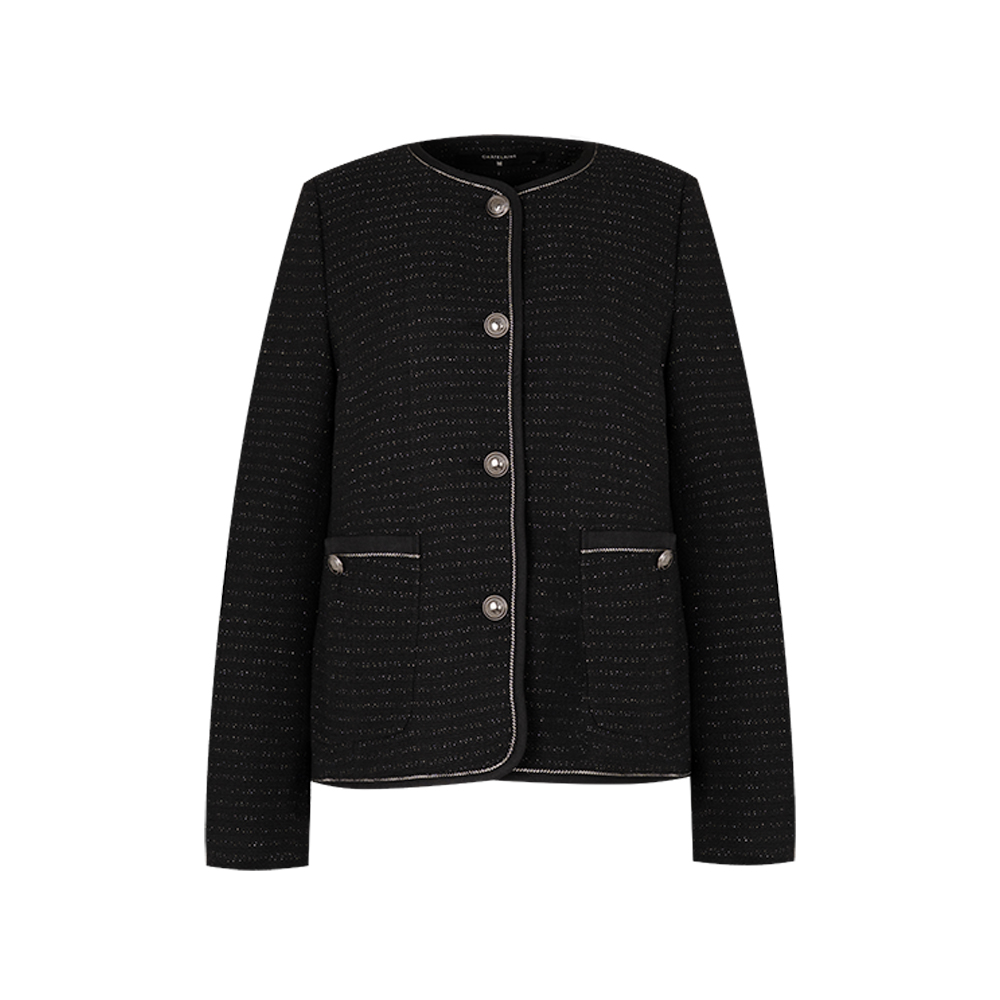 샤트렌 메탈버튼 배색파이핑 노카라 트위드 자켓_HCEFJK102