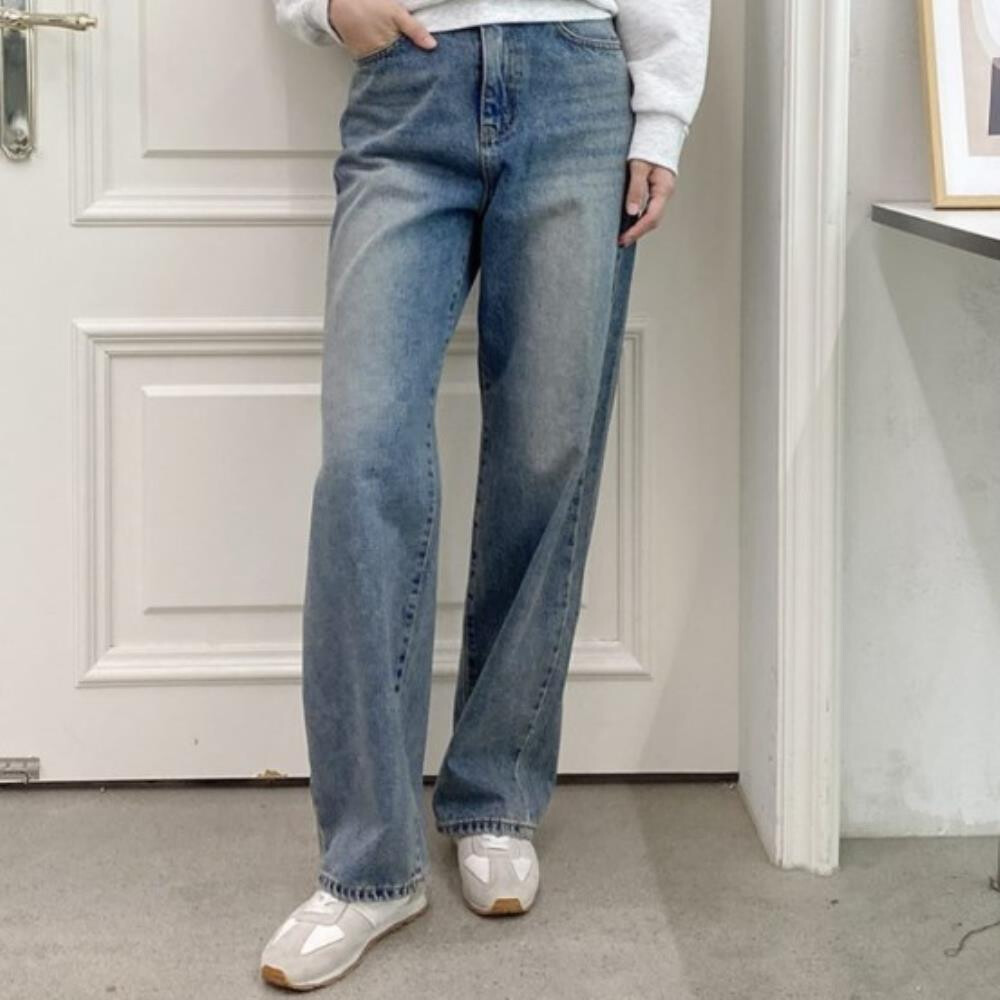 [옷자락] 여성 심플 중청 워싱 뒷밴딩 세미와이드 데님