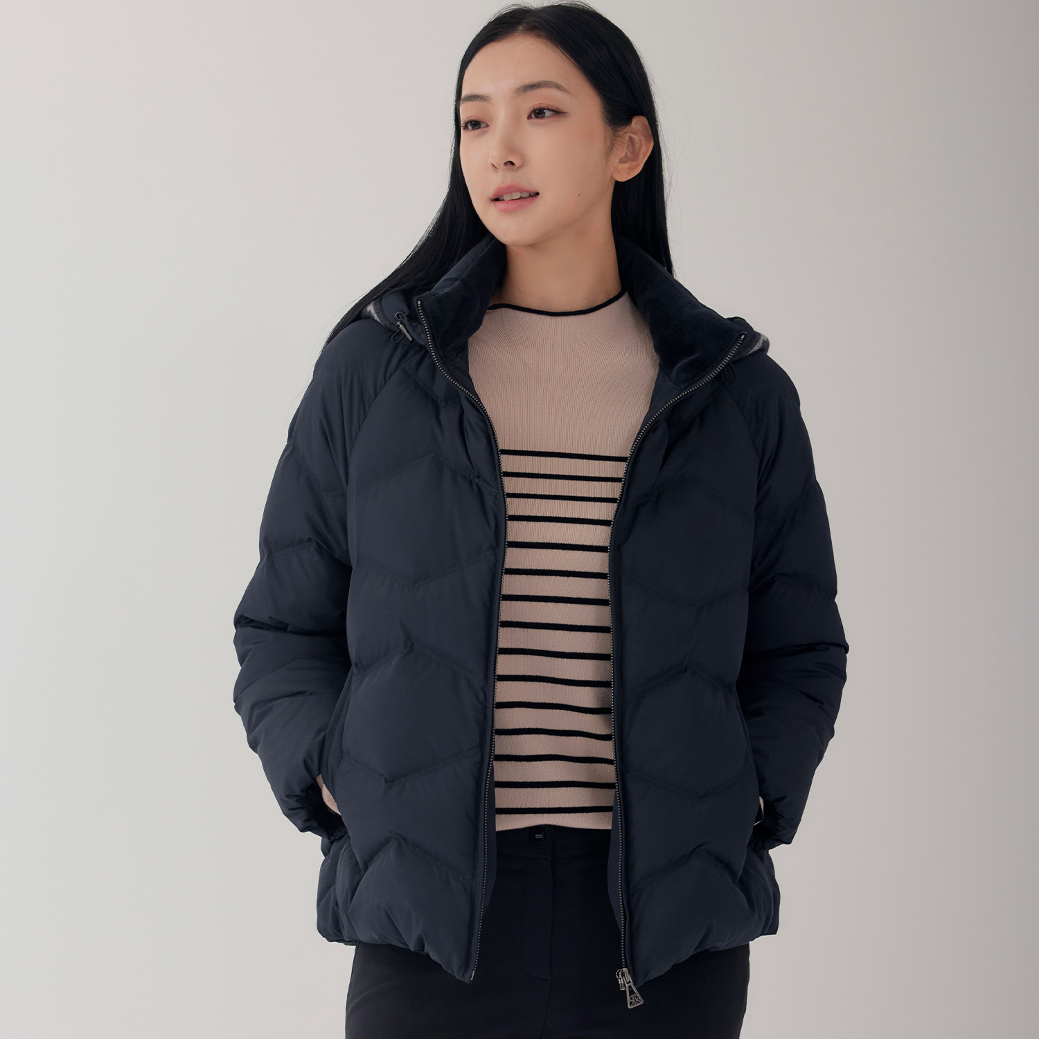 (2컬러) 자가드 니트 후드 덕다운 패딩 LSDWOA52