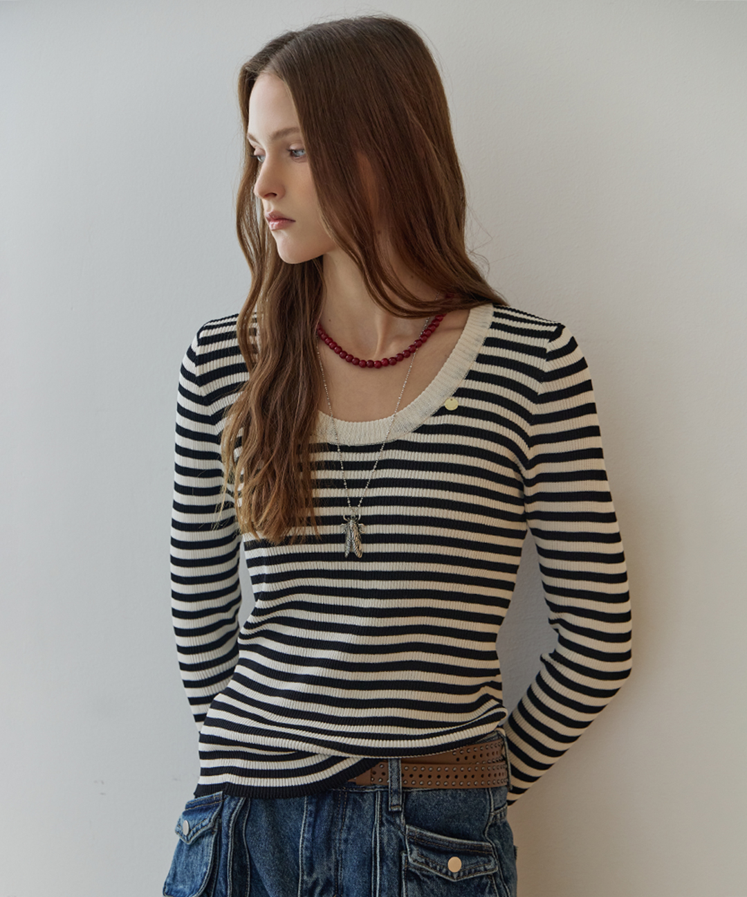 [마쟈] 스트라이프 패턴 U넥 긴팔 니트