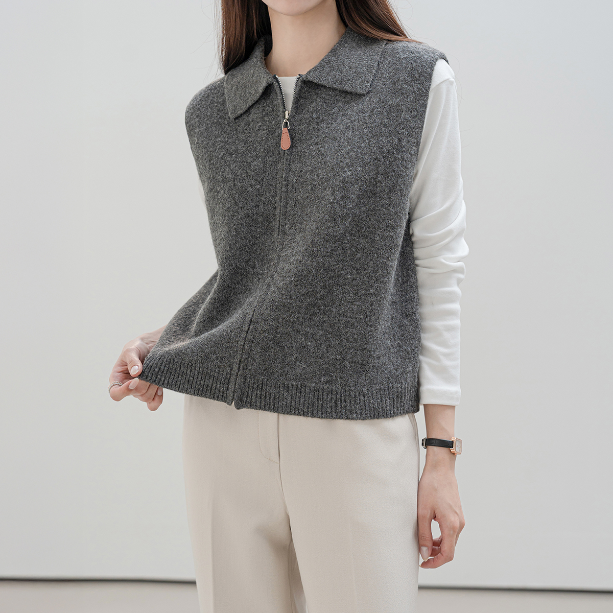 [모노앳디] 투센 카라 니트 집업 베스트