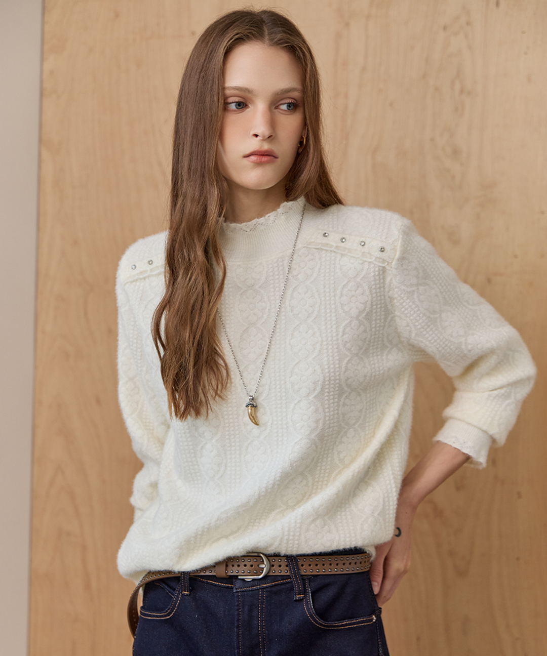 [마쟈] 소프트 헤어리 큐빅 숄더 모크넥 니트