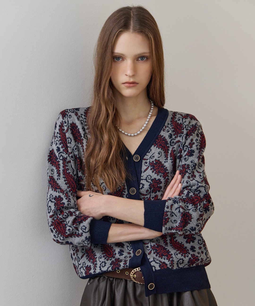 [마쟈] 페이즐리 패턴 브이넥 니트 가디건